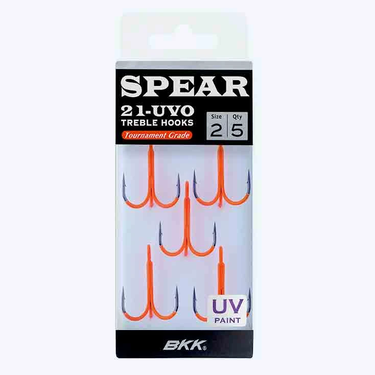 BKK Spear 21 UVO är en trekrok med en fluo röd krok som blir väldigt lysande i UV-ljus. Detta har visat sig vara extremt effektivt när det är dåliga ljusförhållande och när vattnet är lite djupare. Riktigt populär till allt från havsöring till abborre till havsfiske efter t.e.x torsk.