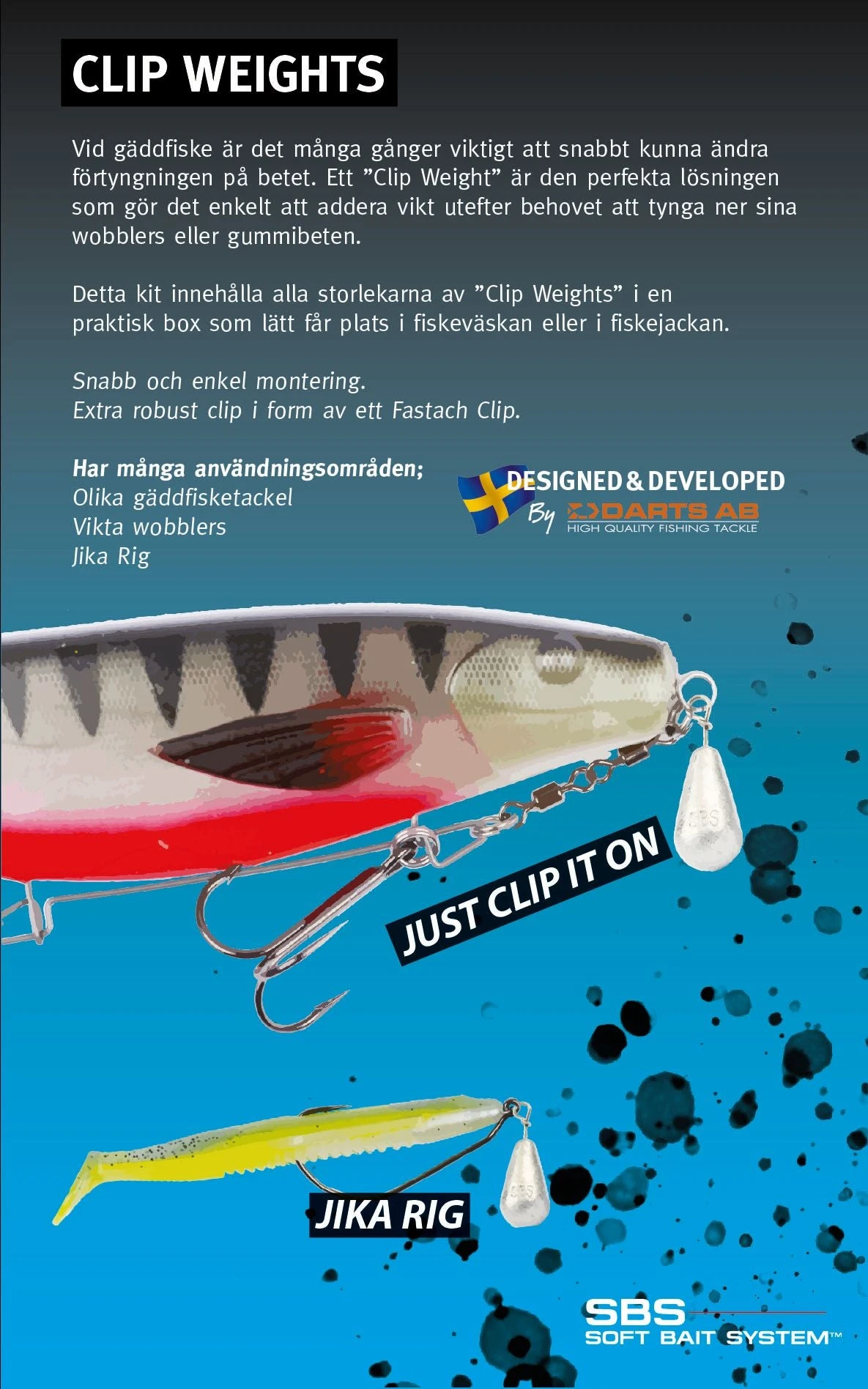 Vid gäddfiske är det många gånger viktigt att snabbt kunna ändra förtyngningen på betet. Ett ”Clip Weight” är det perfekta lösningen som gör det enkelt att addera vikt utefter behovet att tynga ner sina wobblers eller gummibete.