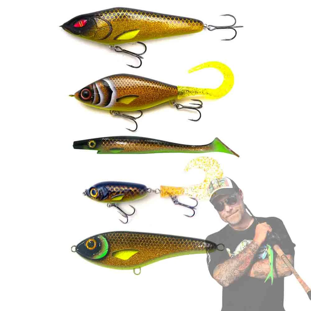I Gäddfemman Kexet Pack 2 hittar du en Pig Shad Junior, en McMio, en Guppie 120 g, en Lazy Jerk och en Buster Jerk. Ett pack som täcker det mesta, dvs två jerkbaits, en jigg, ett tailbete och ett swim-bait/jerk