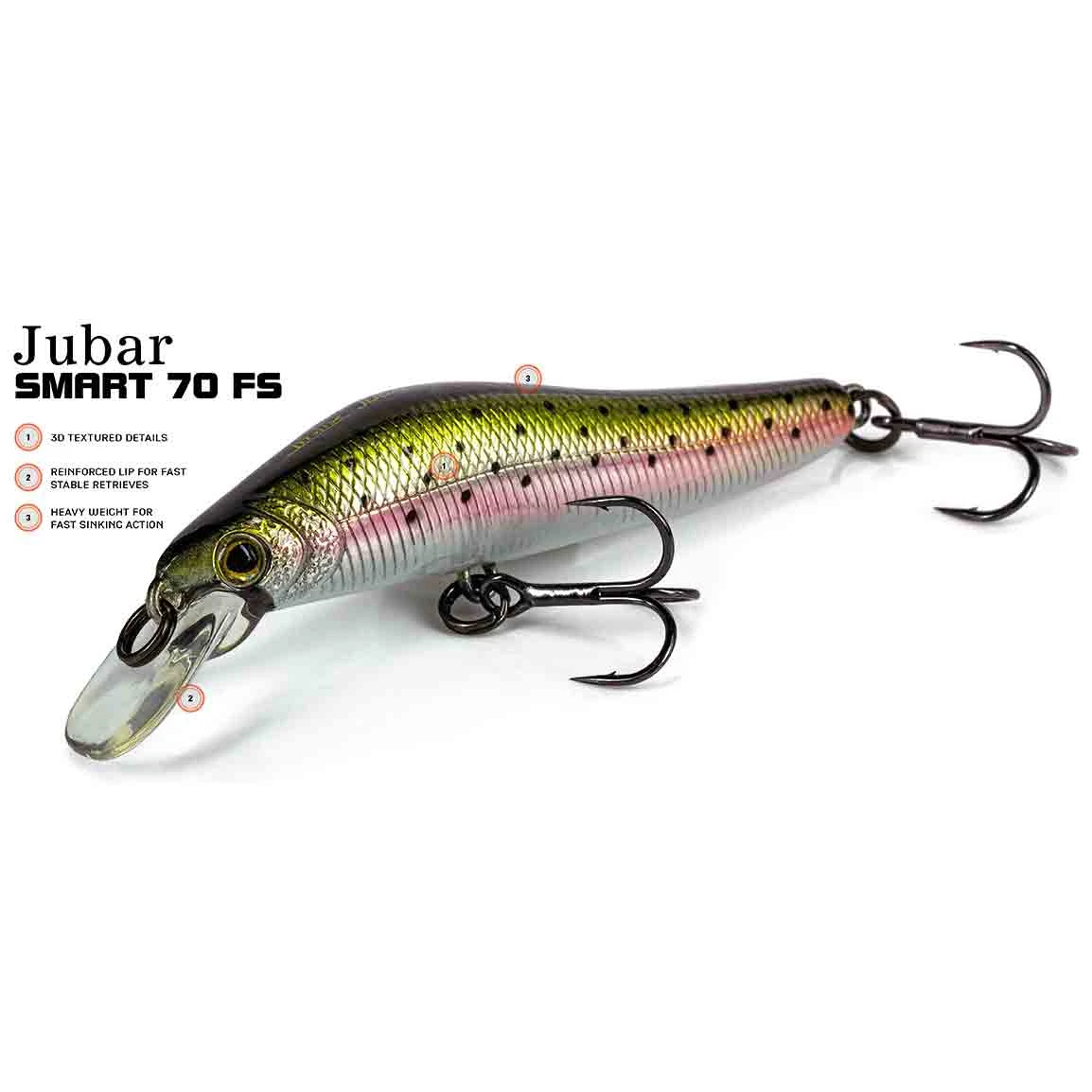 Molix Jubar Smart 70 Fast Sink är en jerk / crankwobbler som sjunker snabbt, dvs att den kommer ner där fisken är snabbt och lätt. Den snabba sjunkhastigheten gör den även till ett riktigt vapen när du fiskar i strömmande vatten. Molix Jubar Smart 70 Fast Sink håller en finish och kvalité som man bara hittar på japanska wobblers.